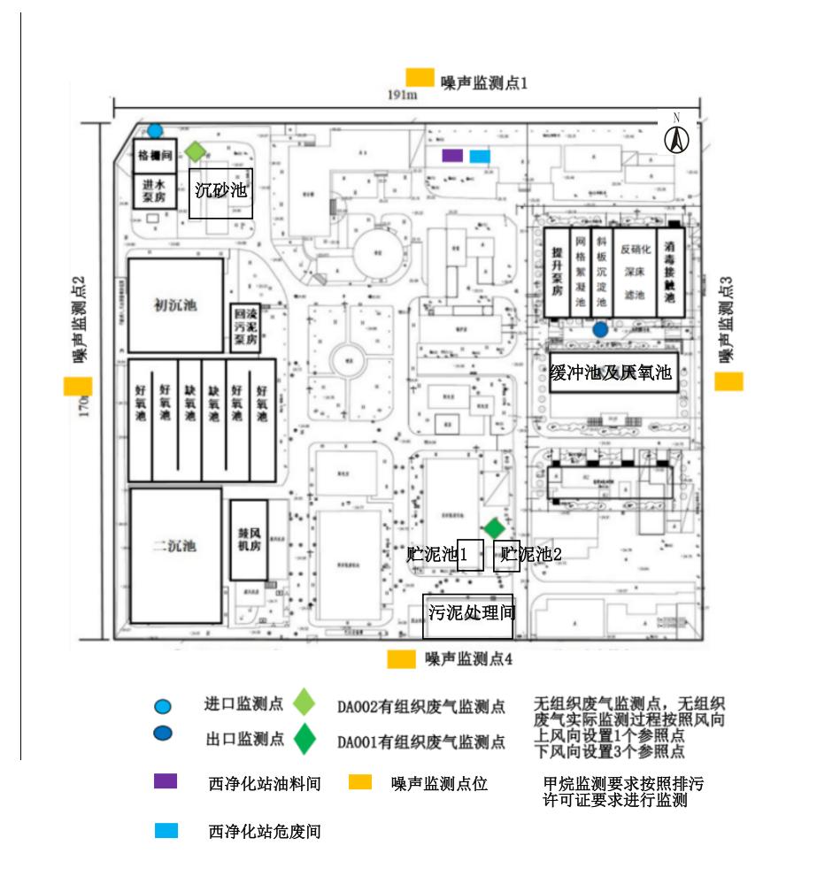 企业自行监测点位示意图。(在厂区平面图上标注监测点位置、名称、编号及经纬度,并附排放口设置的监测点位照片)