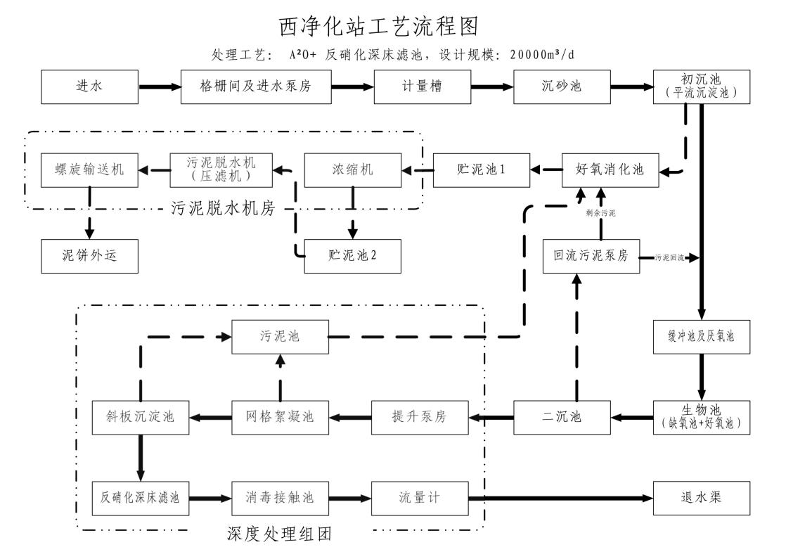 | 治理设施 | 格栅、初沉池、曝气池、厌氧池、二沉池、沙滤间 | ||