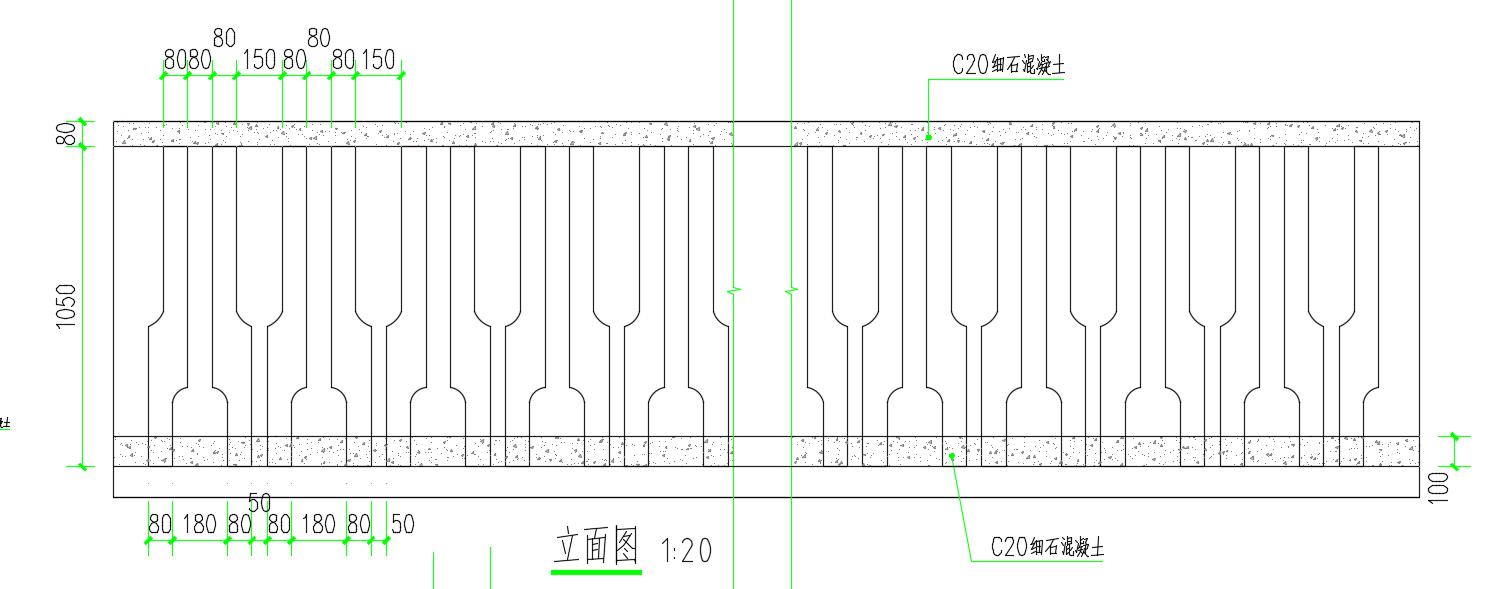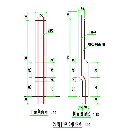 混凝土护栏立柱采用场外预制方式,混凝土强度等级C30,预制护栏高度为1050mm,护栏内部竖向钢筋为2根,Φ8钢筋,两端各预留出10cm;底端使用植筋胶固定与钻好的孔内,植筋胶凝固后,浇筑地袱。上端用于连接护栏扶手,混凝土扶手钢筋。混凝土扶手宽200mm,厚度80mm,扶手钢筋为2根三级钢Φ8钢筋,箍筋为圆钢Φ6@200钢筋钩(附图)浇筑细石混凝土,强度等级C20。
