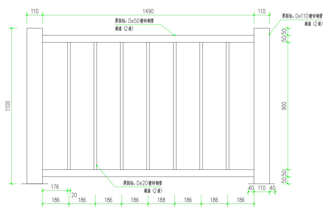 铁质护栏立柱采用场外预制方式,立柱材质应为镀锌钢管,具体尺寸标准见下图,立柱壁厚应为4.0mm,相关技术要求应满足最新版《建筑防护栏杆技术标准》,立柱主体应采用膨胀螺栓固定于地面上。